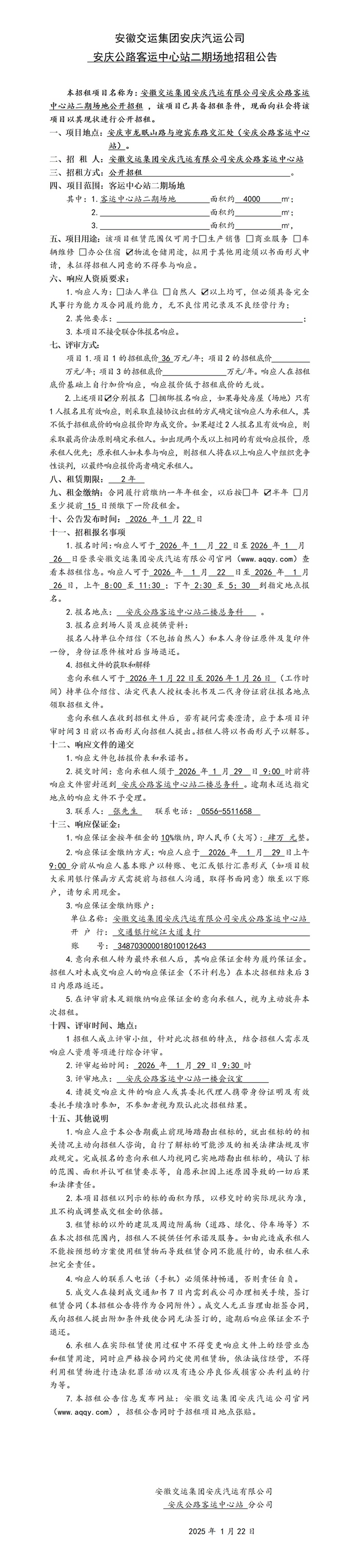 安慶公路客運中心站二期場地招租公告