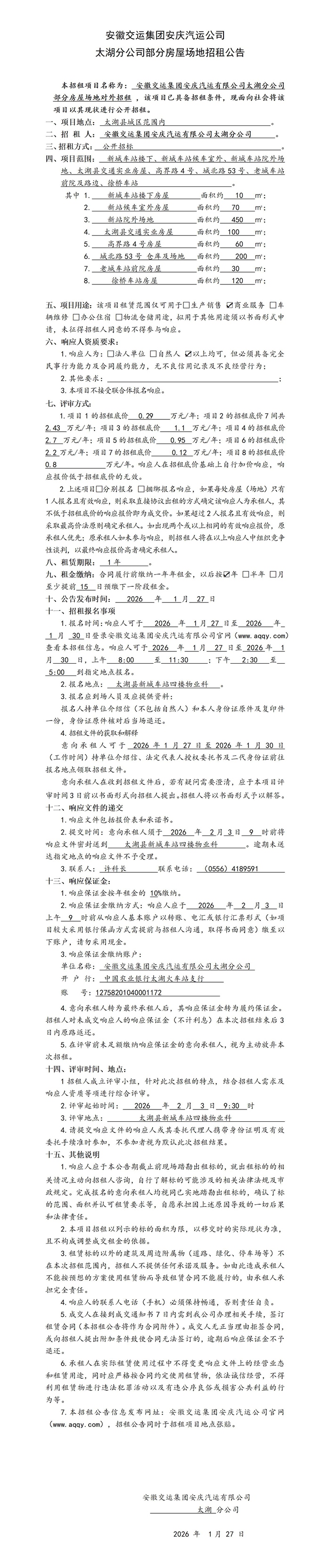 太湖分公司房屋場地招租公告