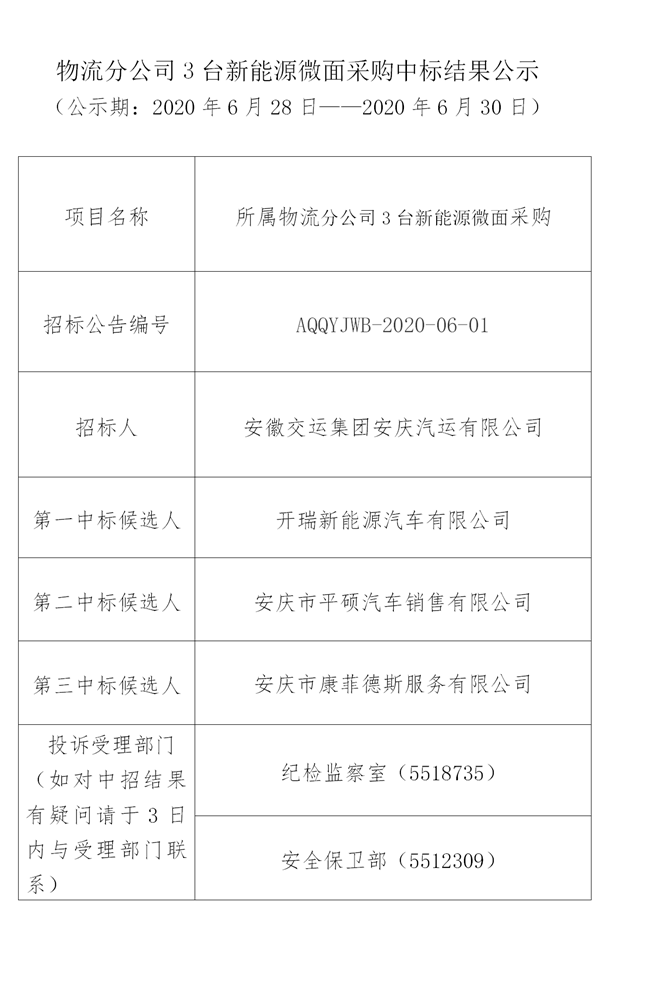 物流分公司3臺新能源微面采購中標結(jié)果公示