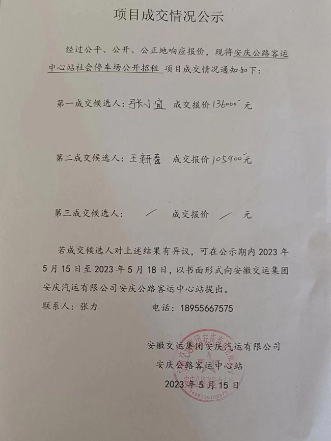 安慶中心站社會(huì)停車場公開招租結(jié)果公示